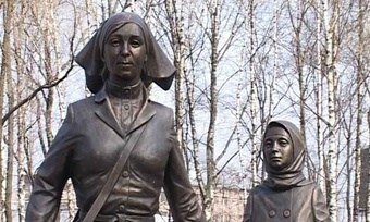 Памятник медсестре установили на привокзальной площади в Череповце. Скульптура посвящена медсестрам, в годы войны спасшим около 2,5 миллионов жизней бойцов и ленинградцев-блокадников, которых привозили на череповецкий вокзал. По задумке автора, медсестра спасает людей от войны, ведет их к мирной жизни.