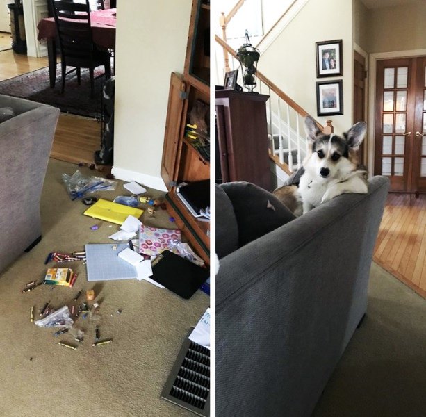 Обычно животные немного грустят, когда их застукивают вот за такими ужасными вещами. Но мой пес, кажется, сохраняет фотогеничное выражение морды даже в такой эмоциональной ситуации!