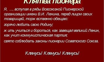 Задумаемся над лозунгом -"Пионер — значит первый!"Одна была привилегия у коммунистов, комсомольцев, пионеров, октябрят — быть всегда добровольцами.Вспомните :"Коммунисты — вперед"-, так говорили бойцам перед боем и они делали этот шаг.Сейчас быть первым — это значит все, что угодно, кроме того, что надо идти в бой, ехать на целину, строить Бам.Первый — это значит - первопроходец, первый — значит брать на себя первому все невзгоды и лишения, а не радости и удовольствия.А сколько пионеров- героев совершили подвиги в Великую Отечественную войну, ведь никто же их не заставлял.Просто так были воспитаны.Сегодня, 19 мая, есть повод вспомнить об этих мальчишках и девчонках с красными галстуками, который давали клятву перед лицом своих товарищей.