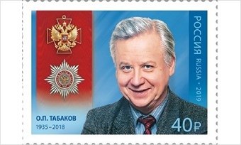 Известно, что Олег Павлович много лет собирал марки, очень любил их. И вот теперь есть почтовый знак и с его изображением. Марка выпущена в серии “Кавалеры ордена “За заслуги перед Отечеством”. Художник: О. Савина, а фотографию выбрали ту, что в своё время сделал В. Плотников.