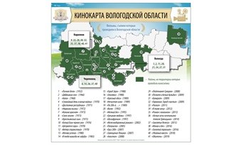 На карте обозначены места, в которых снимали известные художественные фильмы. В разное время на территории региона работали такие режиссёры, как Алексей Балабанов, Никита Михалков, Андрей Кончаловский, Карен Шахназаров и другие.